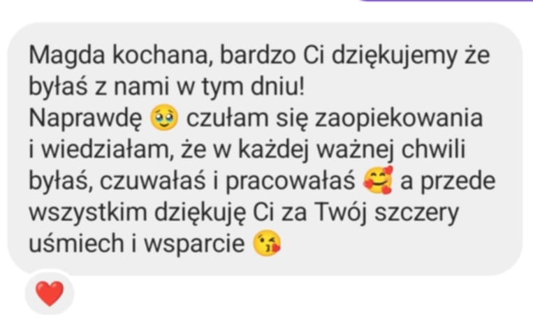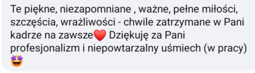 „Madziu dopiero mamy chwilę żeby coś sklecić ale nie będzie w stanie opisać tego jak bardzo dziękujemy za pamiątkę którą nam dałaś. Całe Twoje zaangażowanie, umiejętności i to jaka jesteś powoduje że do tej pory mamy uśmiechy i ja oczywiście 😅 lekkie wzruszenia. Współpraca z Tobą była wspaniała i mam nadzieję że jeszcze spotkamy się na niejednej sesji bo jesteś po prostu pięknym człowiekiem który lubi ludzi co ja Ci więcej powiem, wiesz co robisz i to tworzy piękne kadry, nie mówię tylko o tych weselnych 😉😉
